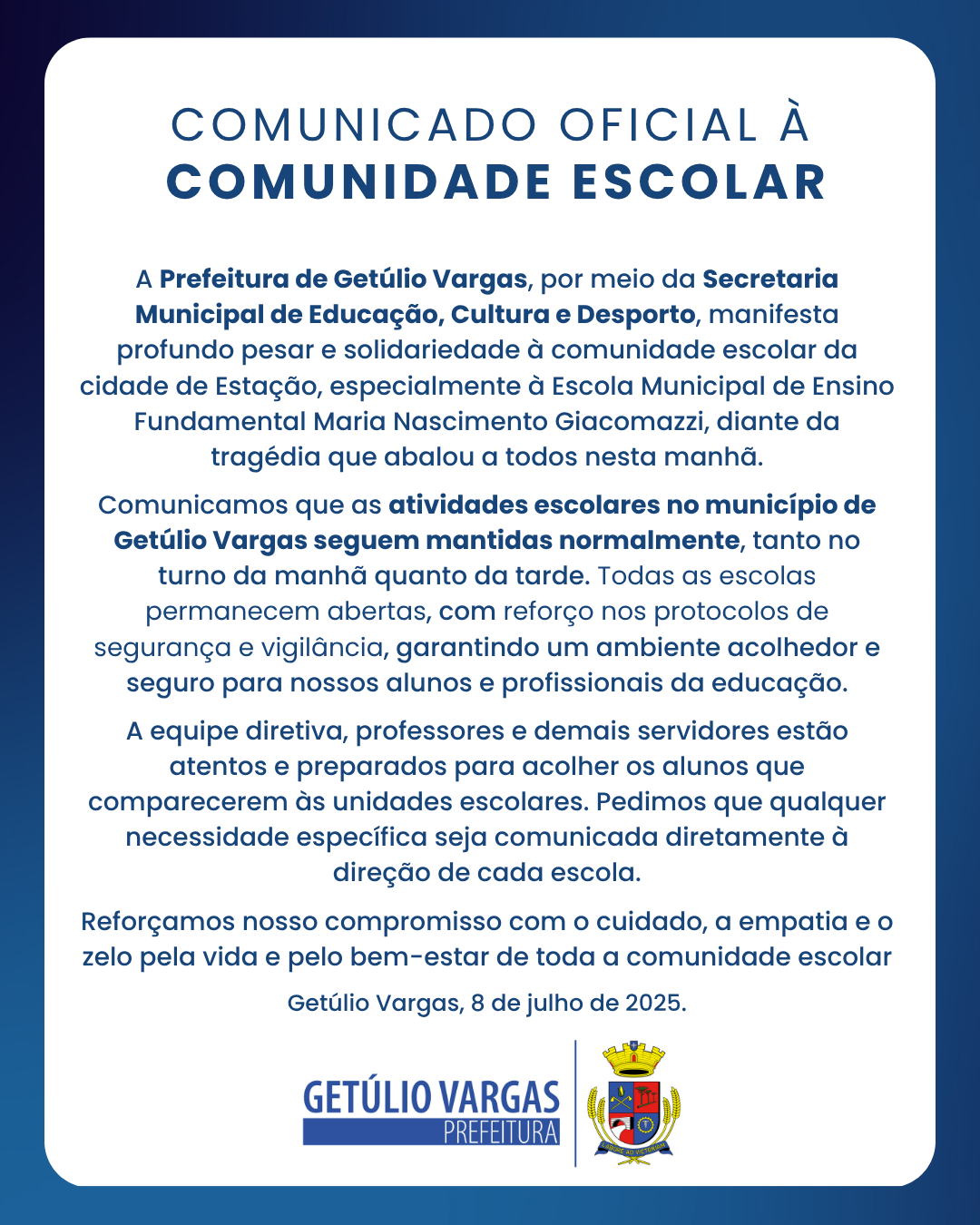 As aulas na rede municipal de Getúlio Vargas seguem normalmente nesta terça-feira, 8 de julho.