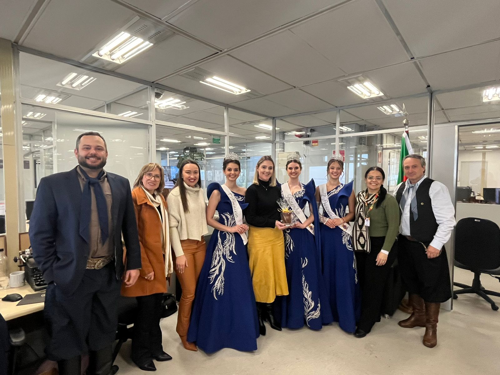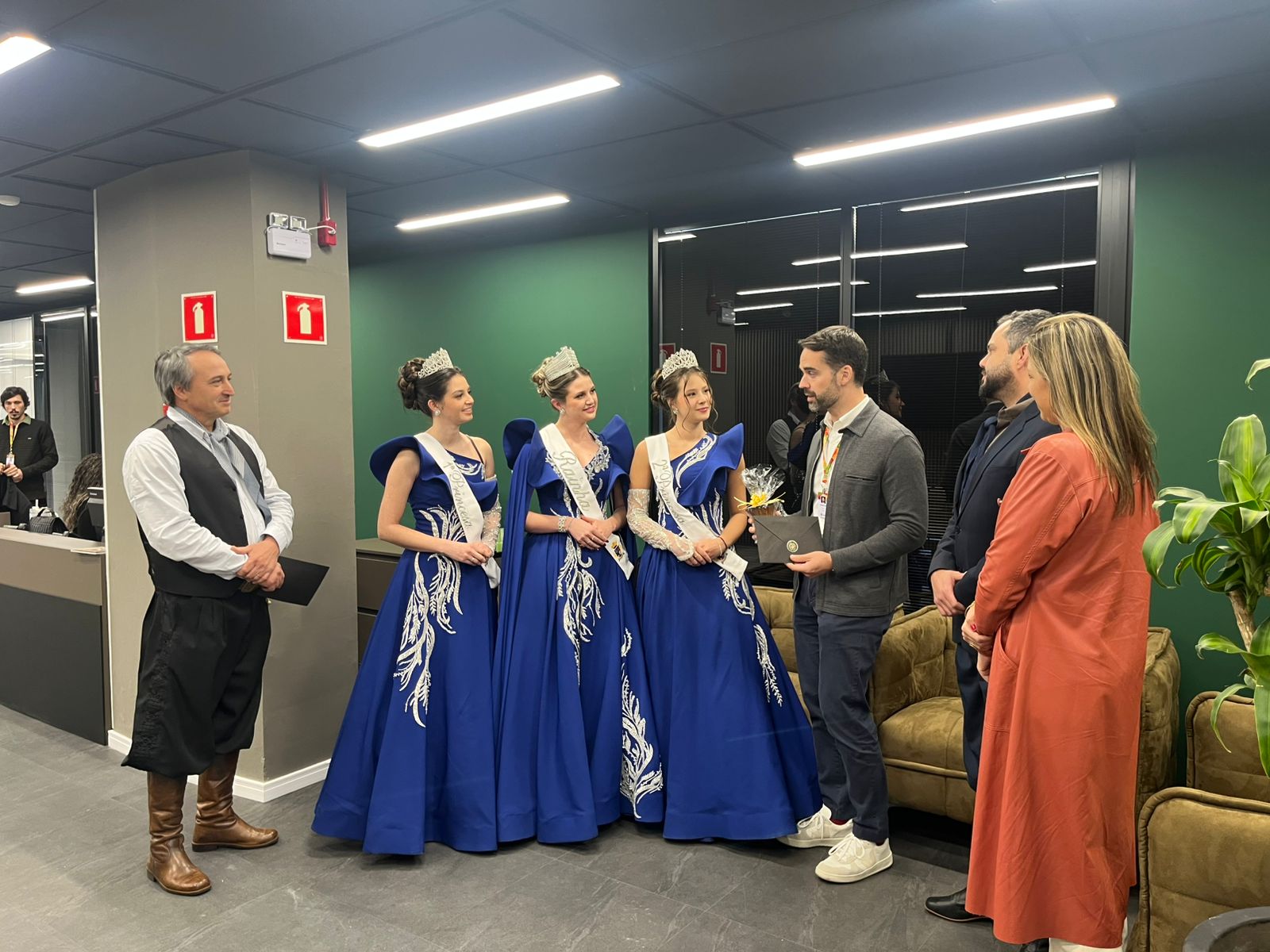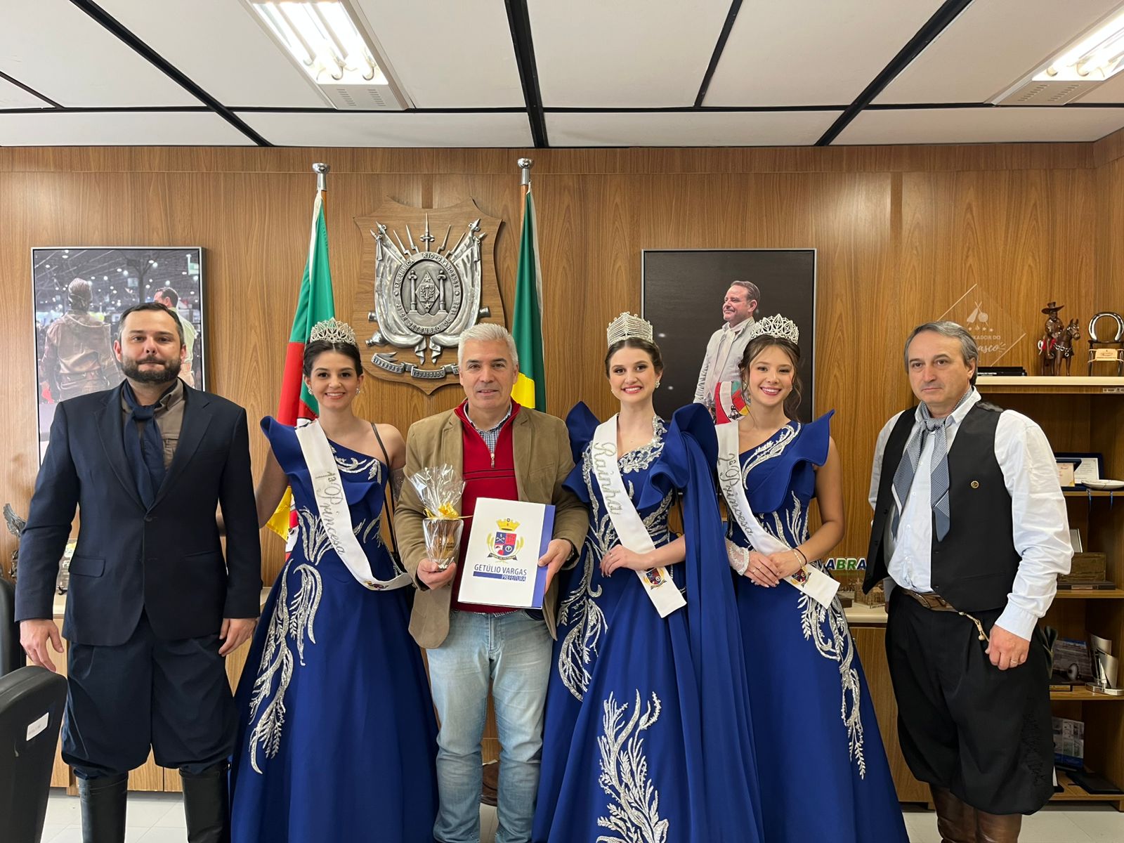 A Corte de Getúlio Vargas, formada pela Rainha Milena Taliza Cazzonato e pelas Princesas Vanusa Vieira da Silva e Paloma Marcon Baruffi, esteve nesta terça-feira, 26, no Palácio Piratini, em Porto Alegre, para entregar pessoalmente ao governador do Rio Grande do Sul, Eduardo Leite, o convite oficial para participar da abertura do evento, que acontece no dia 12 de setembro, às 18h, no Acampamento Farroupilha. Durante a audiência, a comitiva presenteou o governador com uma cuia de chimarrão personalizada com a marca do Acampamento.