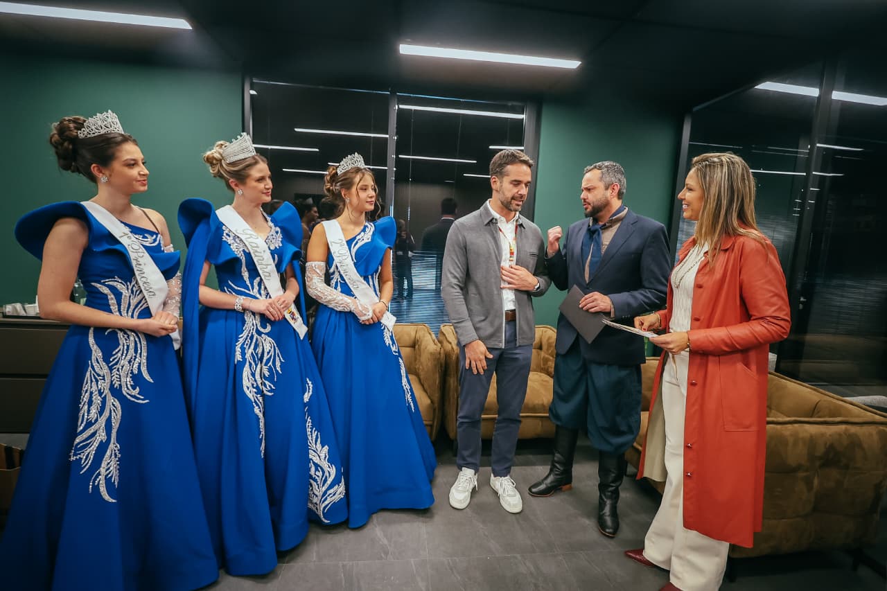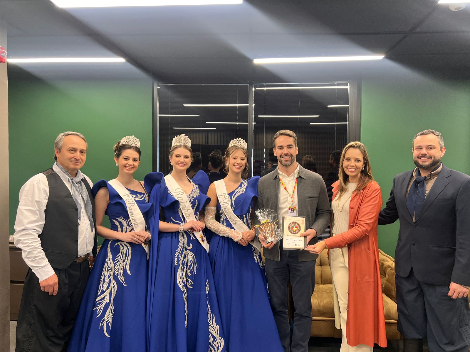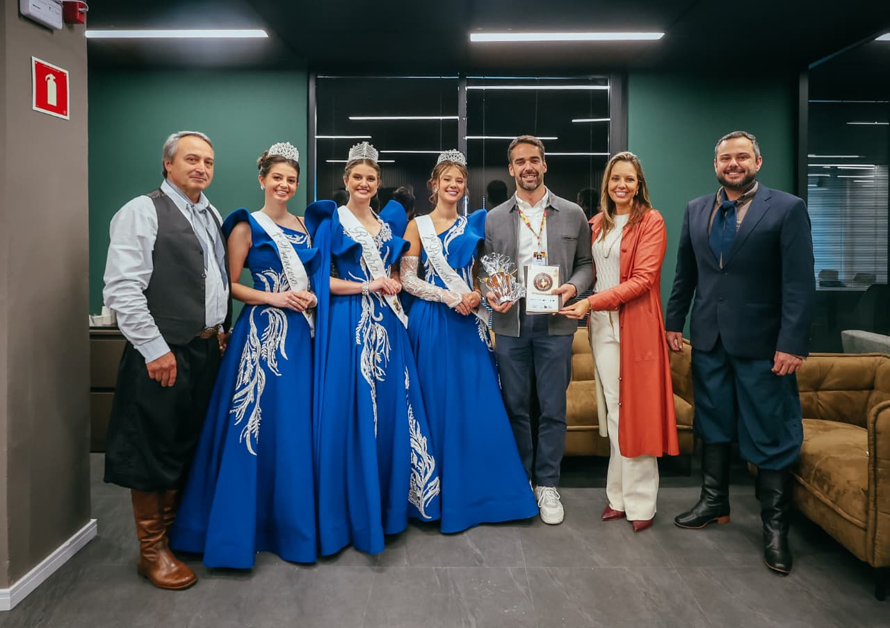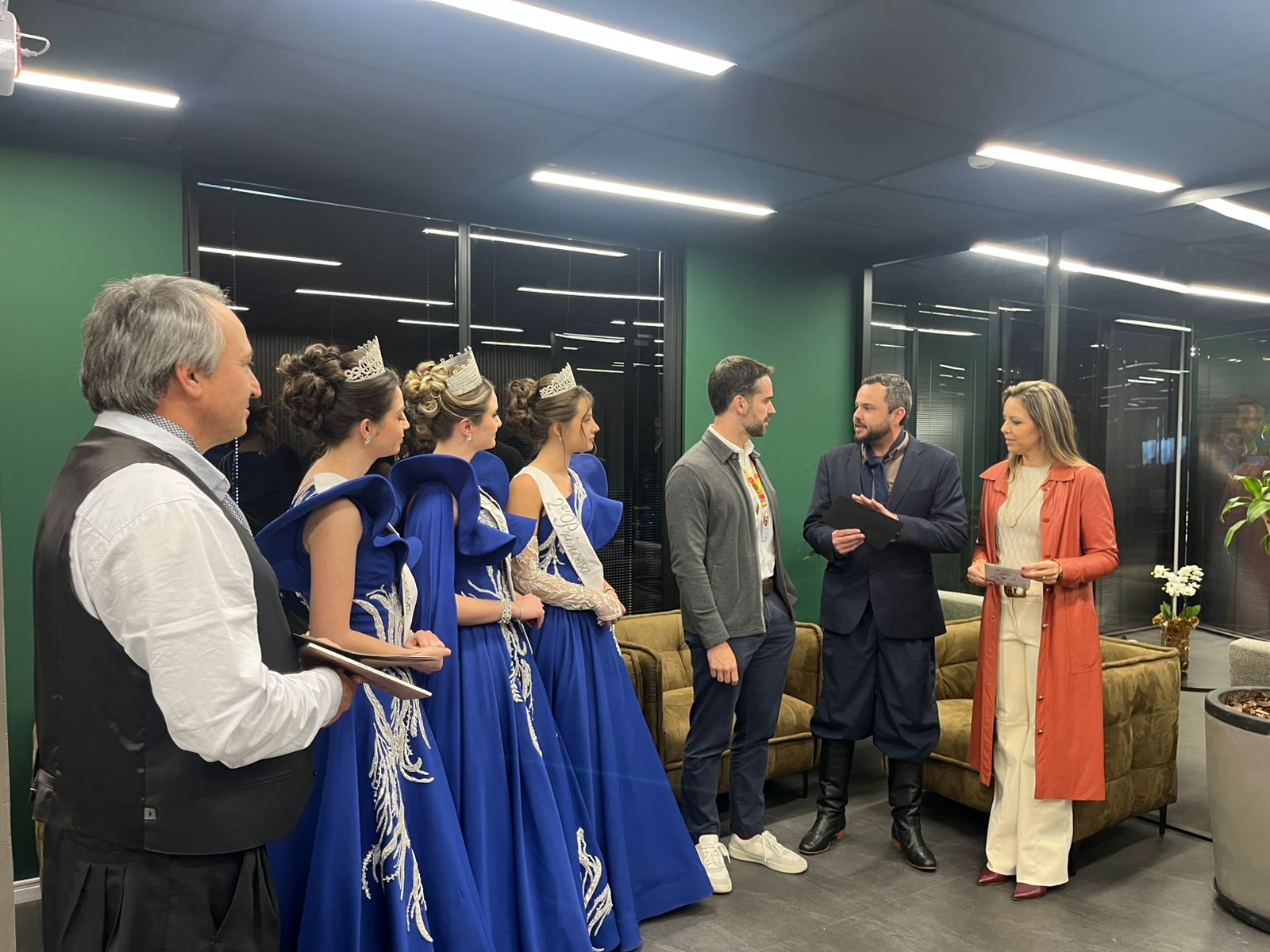 A Corte de Getúlio Vargas, formada pela Rainha Milena Taliza Cazzonato e pelas Princesas Vanusa Vieira da Silva e Paloma Marcon Baruffi, esteve nesta terça-feira, 26, no Palácio Piratini, em Porto Alegre, para entregar pessoalmente ao governador do Rio Grande do Sul, Eduardo Leite, o convite oficial para participar da abertura do evento, que acontece no dia 12 de setembro, às 18h, no Acampamento Farroupilha. Durante a audiência, a comitiva presenteou o governador com uma cuia de chimarrão personalizada com a marca do Acampamento.