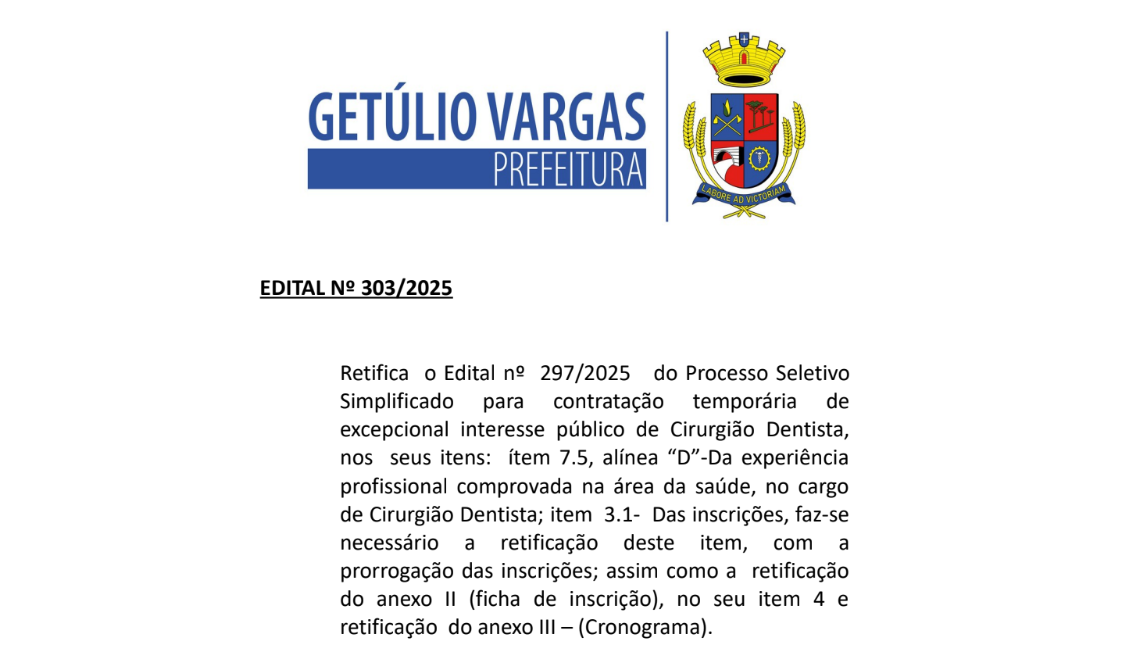 EDITAL 303-2025 RETIFICA PROCESSO SELETIVO - CIRURGIÃO DENTISTA