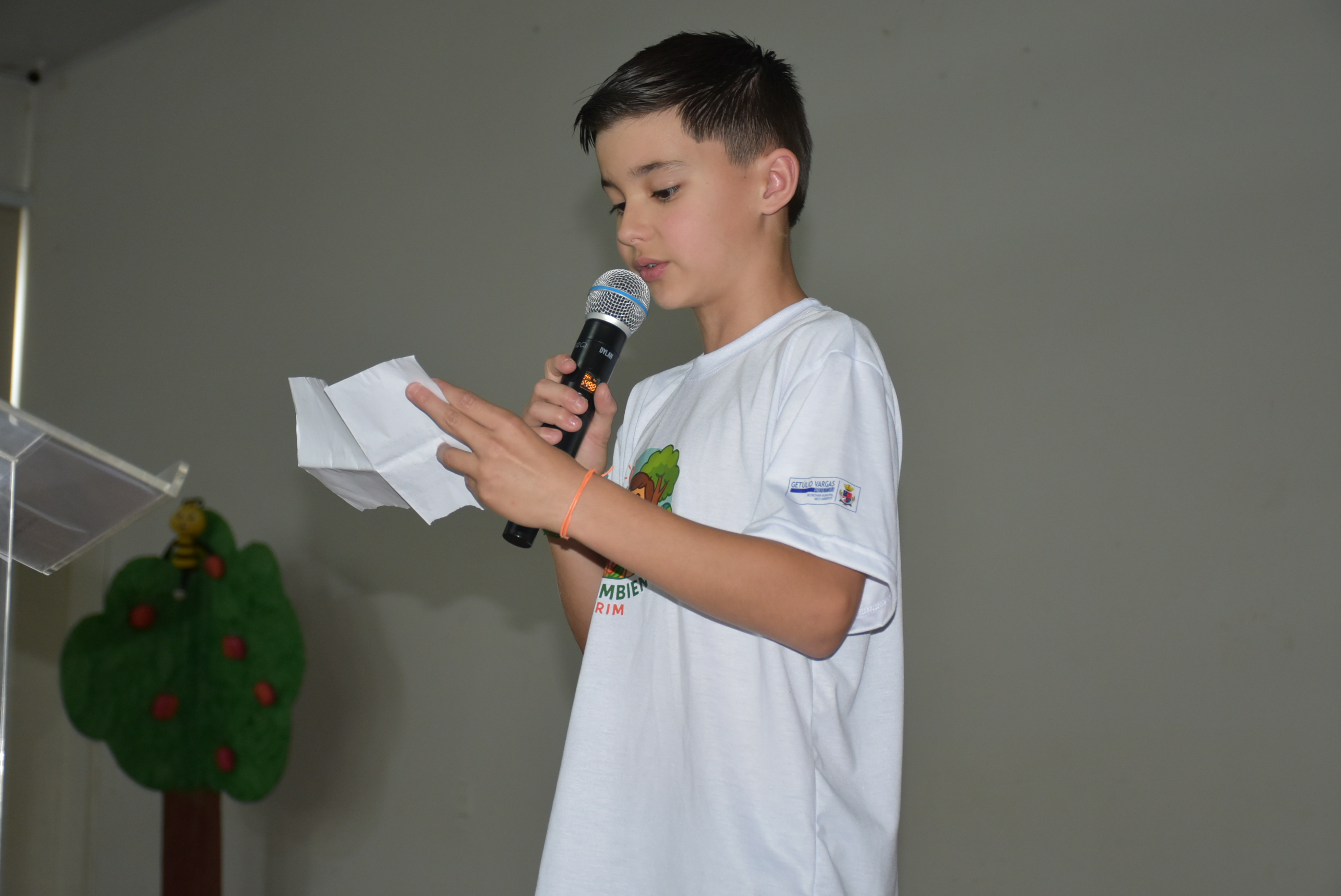 Durante a solenidade, o aluno Guilherme Rayer, da EMEF 15 de Novembro, conduziu o juramento dos novos fiscais, que se comprometeram a ser agentes de transformação e defesa do meio ambiente.