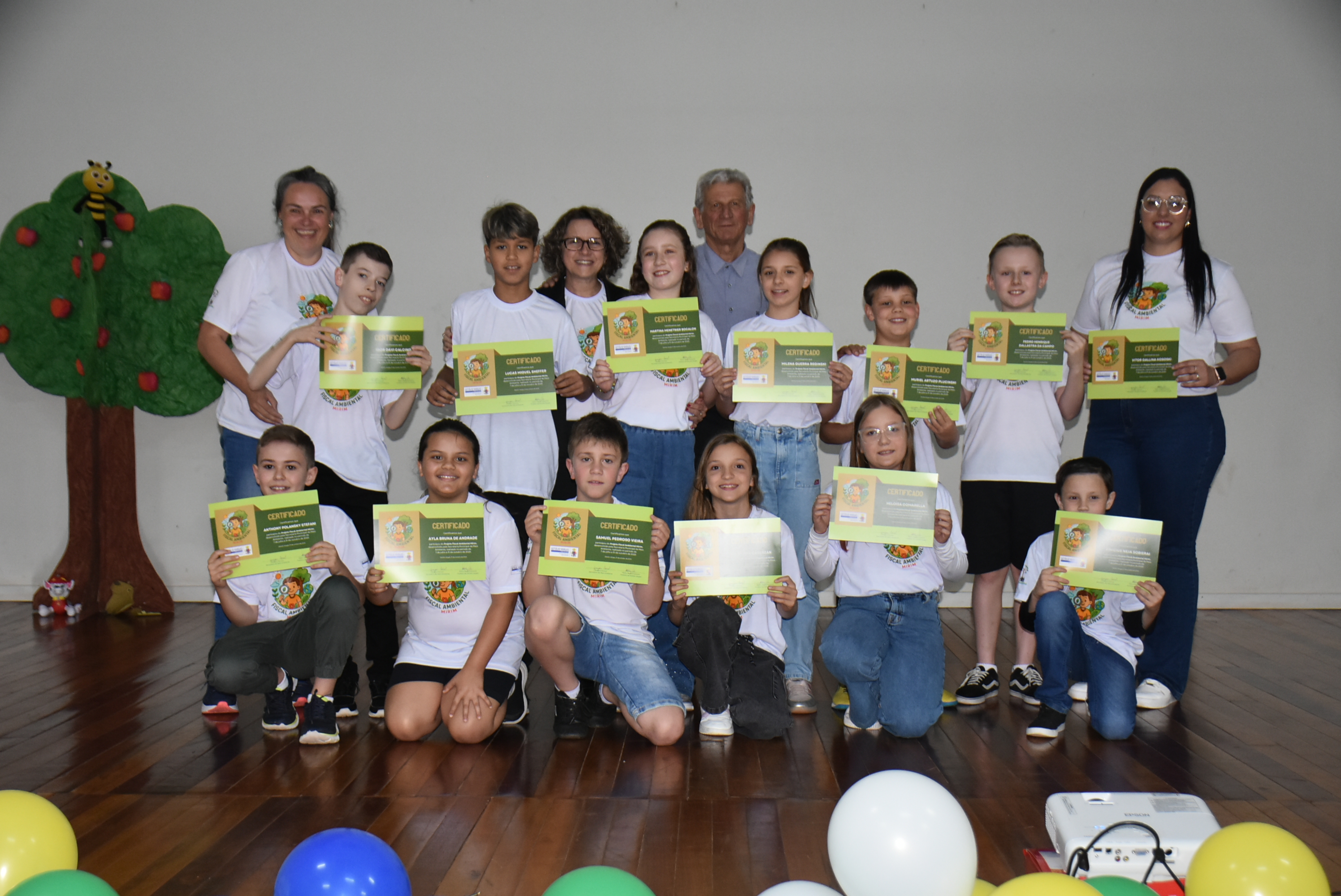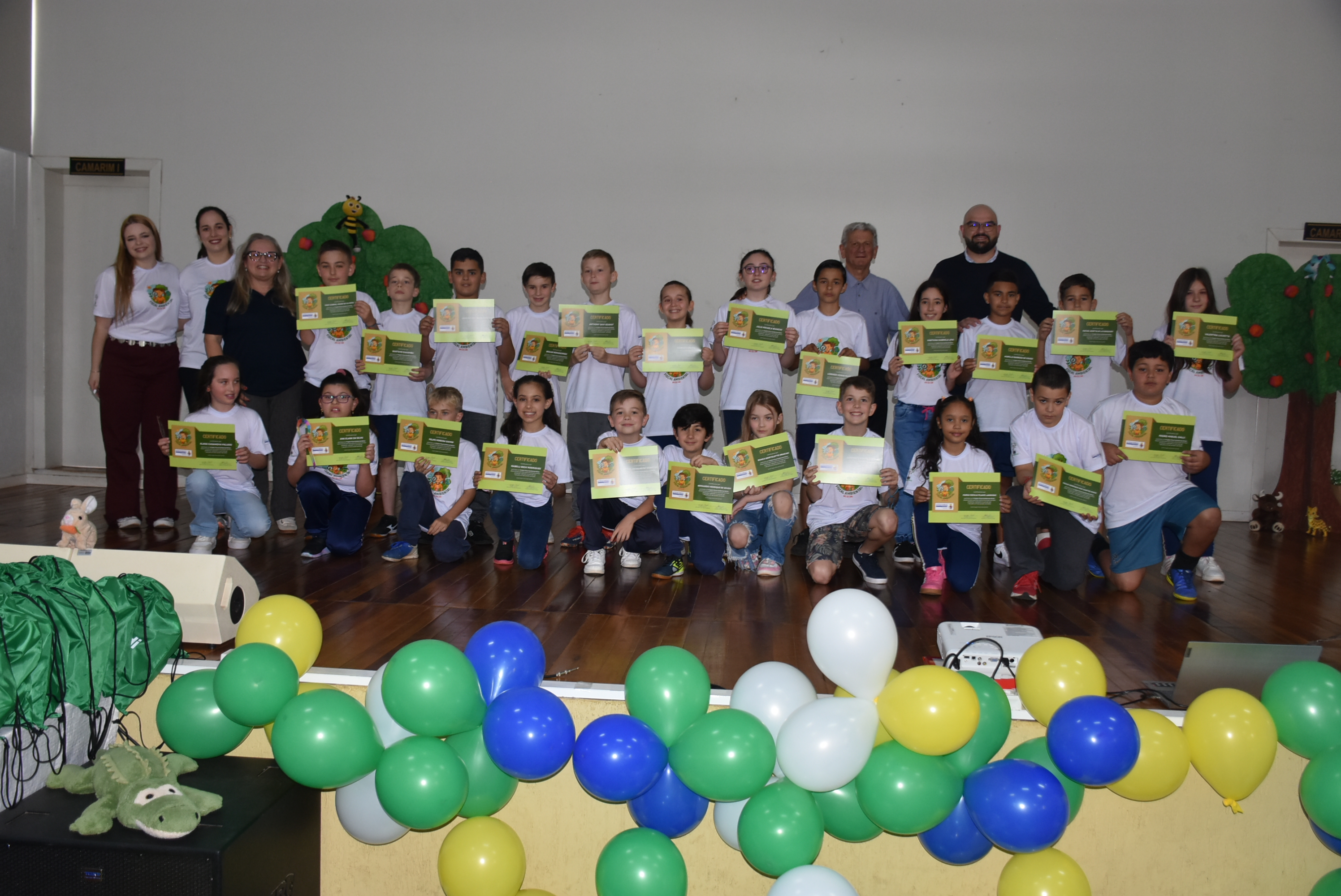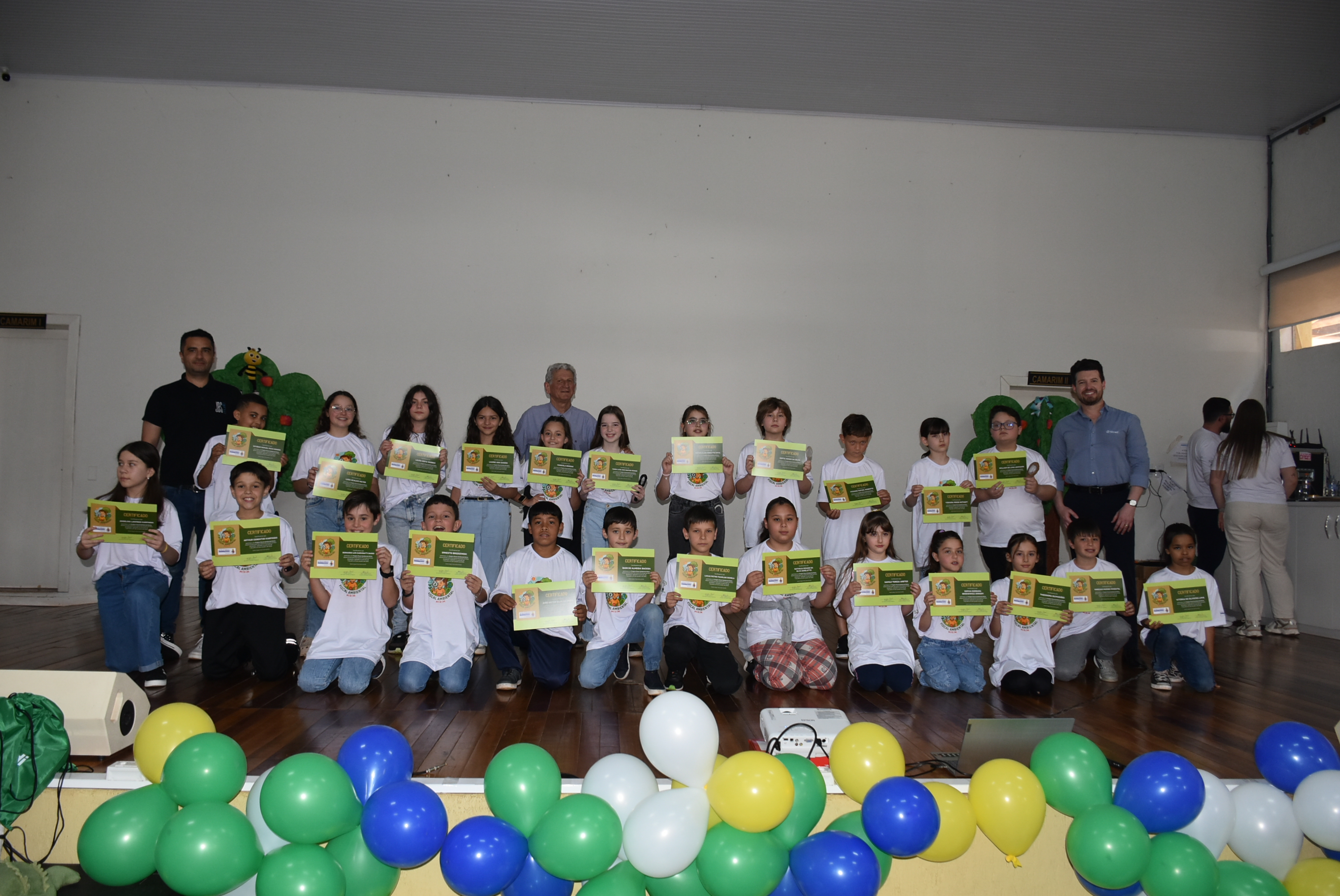 A entrega dos certificados e mimos encerrou a tarde com emoção e orgulho. Professoras, coordenadoras, diretoras, equipe técnica e empresas parceiras também foram homenageadas pelo envolvimento e apoio ao projeto. A cerimônia terminou com a divulgação dos vencedores do concurso do mascote oficial e uma mensagem coletiva: cuidar da natureza é cuidar da vida e o futuro já começou nas mãos dessas crianças. O nome do mascote é Lupildo, o Guardião Verde! e as vencedoras foram: Martina Bocalon, da Escola Pedro Herrerias, deu o nome de Lupildo e Sophia Emanuelle Vargas da Escola Padre Manoel da Nóbrega, deu o nome de Guardião Verde.