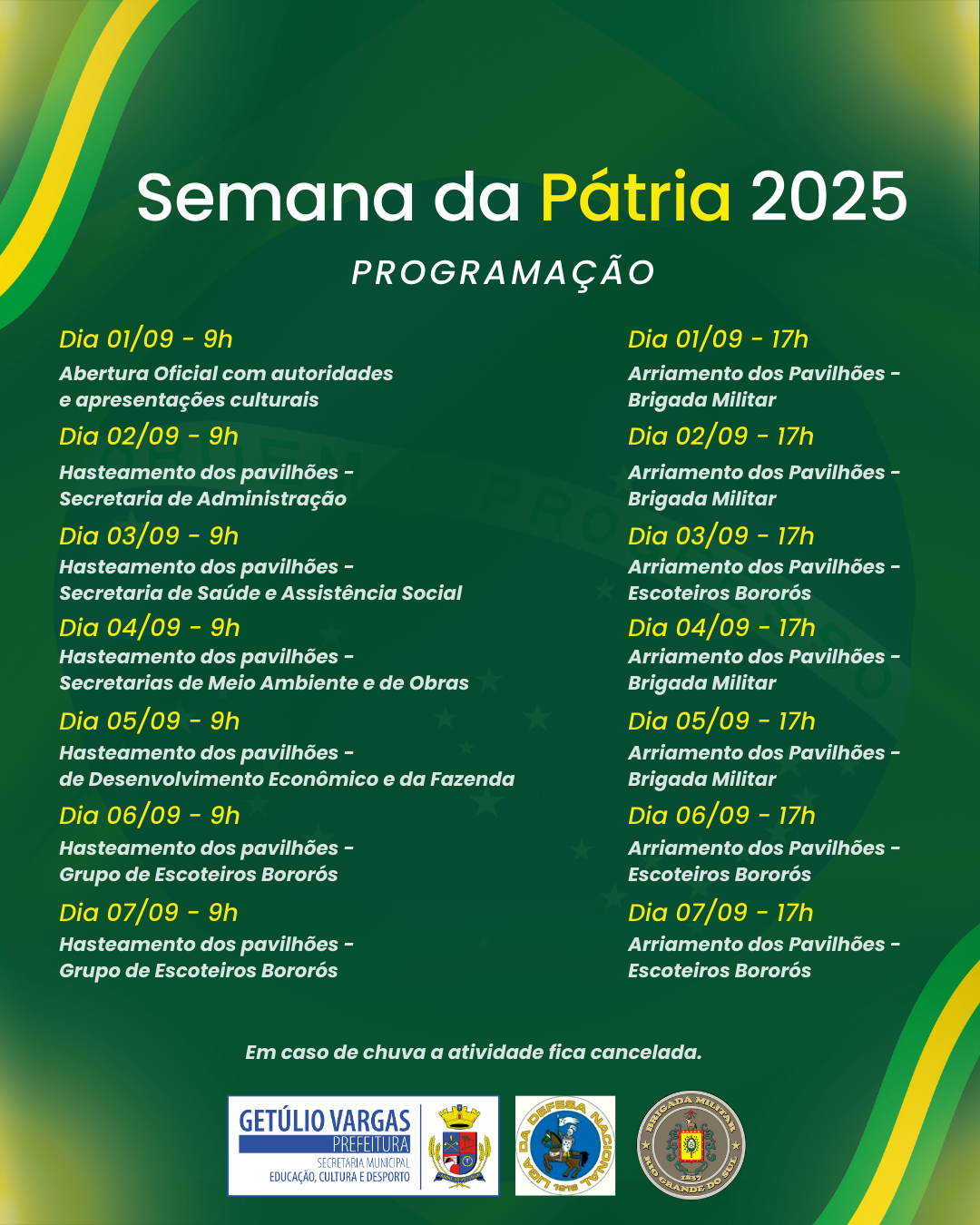 A Prefeitura de Getúlio Vargas, por meio da Secretaria Municipal de Educação, Cultura e Desporto (SMECD), divulgou a programação oficial da Semana da Pátria 2025. As solenidades de hasteamento e arriamento das bandeiras ocorrerão entre os dias 1º e 7 de setembro, sempre no Altar da Pátria, em frente à Igreja Matriz Imaculada Conceição.
