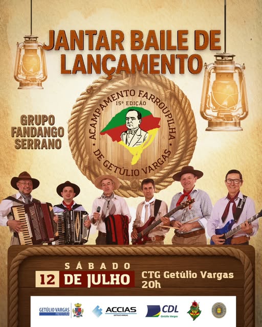 A tradição gaúcha ganhará ainda mais força em Getúlio Vargas com o Jantar Baile de Lançamento da 15ª edição do Acampamento Farroupilha, marcado para o dia 12 de julho, sábado, a partir das 20h, no CTG Getúlio Vargas. A noite festiva será embalada pelo Grupo Fandango Serrano, que promete animar o público com o melhor da música tradicionalista.