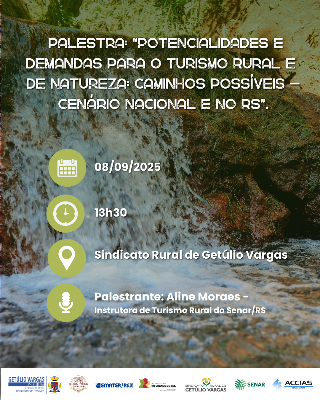 A Prefeitura de Getúlio Vargas, por meio da Secretaria de Desenvolvimento Econômico – Departamento de Turismo, a Accias, o Sindicato Rural, o Senar/RS e a Emater/Ascar, juntamente com o Roteiro Turístico Rural – Getúlio Vargas: Fé, Cultura e Tradição, realizam no dia 8 de setembro, às 13h30, no Sindicato Rural de Getúlio Vargas, a palestra “Potencialidades e demandas para o Turismo Rural e de Natureza: caminhos possíveis – Cenário nacional e no RS”.