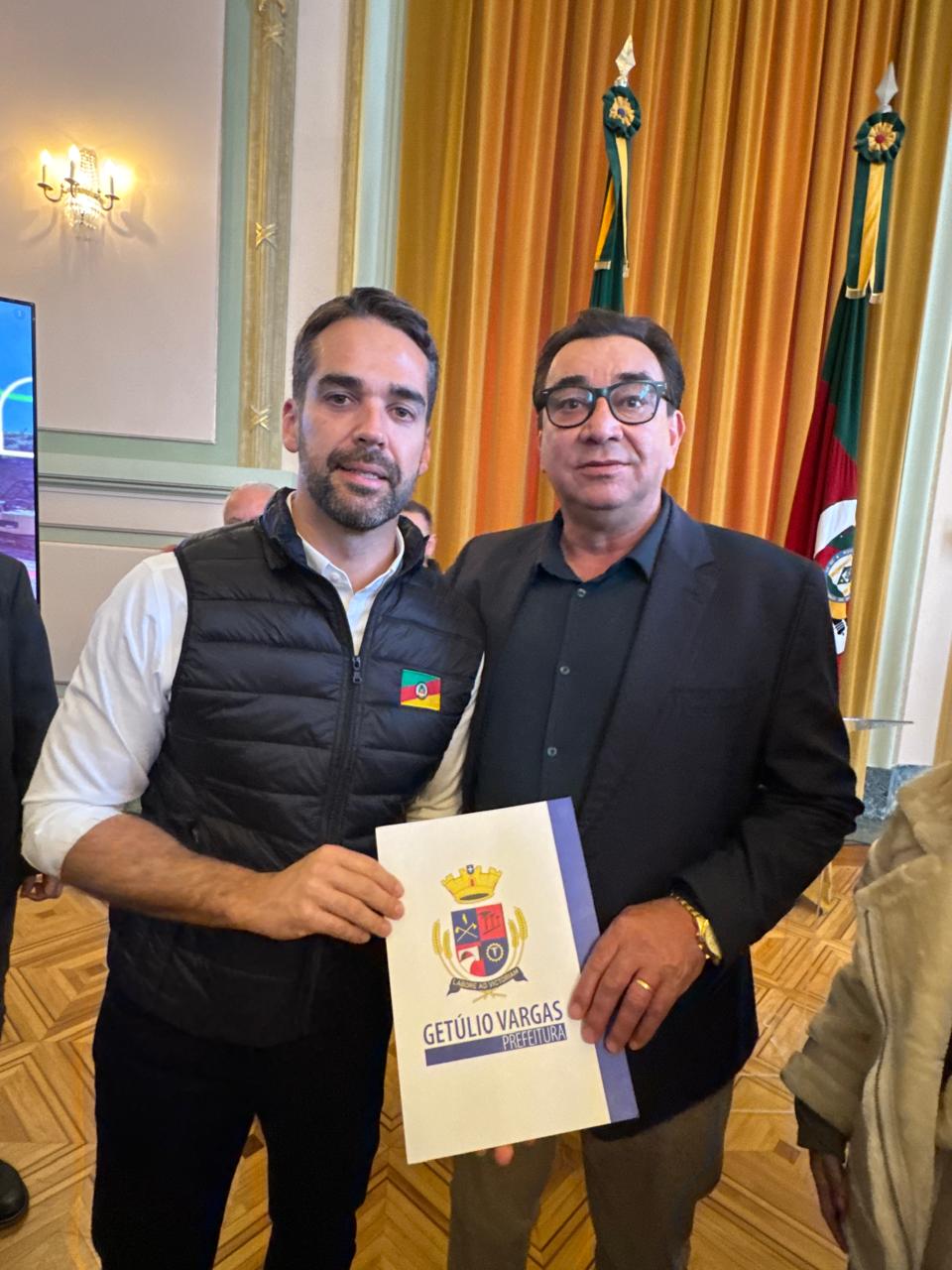 O secretário municipal de Obras de Getúlio Vargas, Sérgio Lima, representando o prefeito Pedro Paulo Prezzotto, recebeu, na manhã desta sexta-feira (15), a confirmação oficial da adesão do município à Fase 2 do Programa Desassorear RS diretamente das mãos do governador Eduardo Leite.