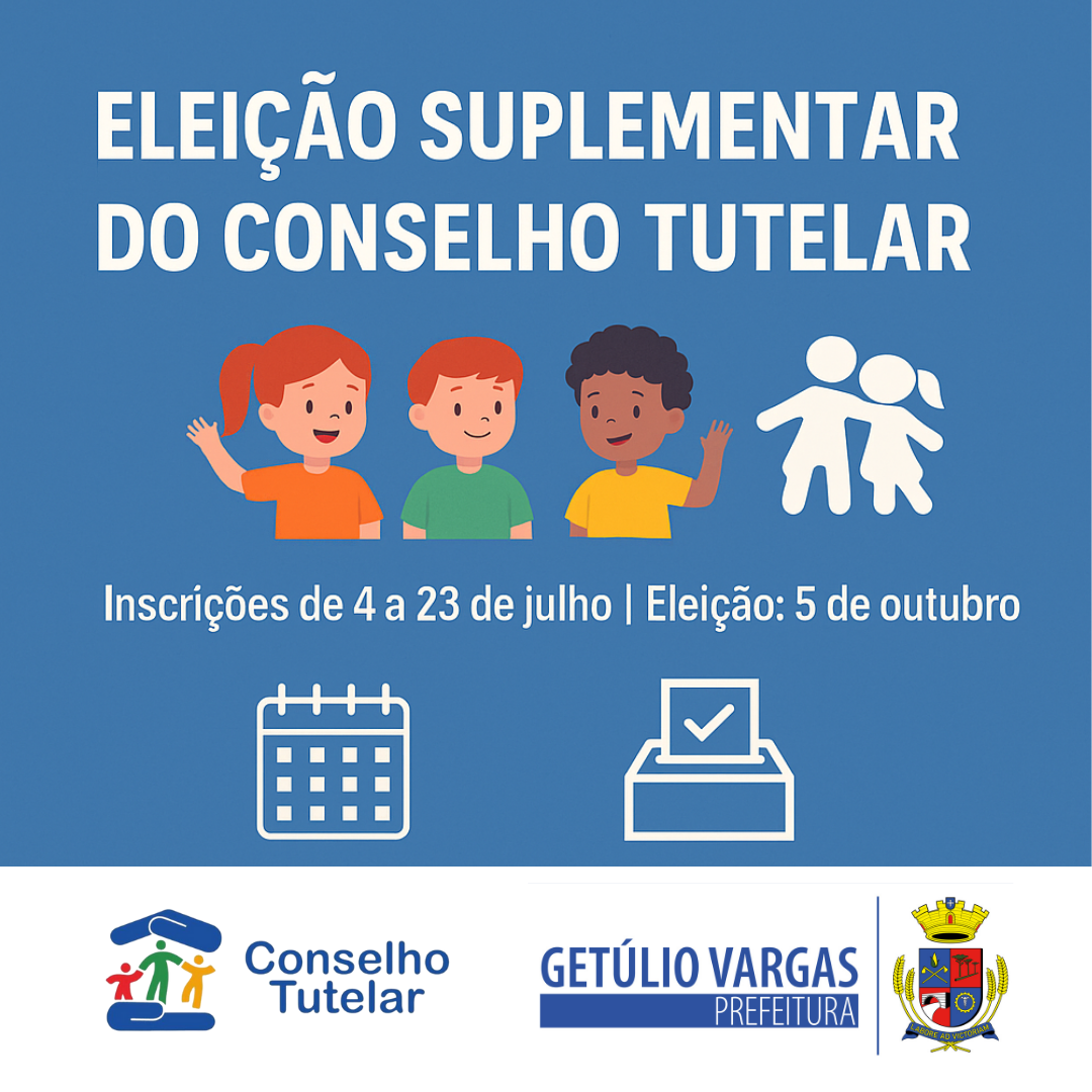 O Conselho Municipal dos Direitos da Criança e do Adolescente (COMDICA) de Getúlio Vargas lançou o edital nº 001/2025 que regulamenta o processo de escolha suplementar de cinco membros suplentes do Conselho Tutelar. A eleição ocorrerá no dia 5 de outubro de 2025, das 8h às 17h, em locais ainda a serem divulgados, e será conduzida por meio de voto direto, uninominal, secreto, universal e facultativo, dos cidadãos do Município, com fiscalização do Ministério Público.