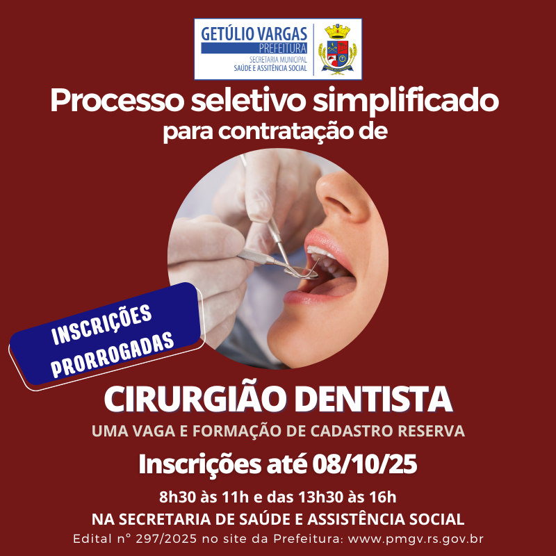 A Prefeitura de Getúlio Vargas informa que as inscrições para o Processo Seletivo Simplificado de Cirurgião-Dentista foram prorrogadas até o dia 8 de outubro de 2025. A alteração consta na retificação do Edital nº 297/2025, que atualizou itens referentes às inscrições, experiência profissional e fichas anexas. Os candidatos já inscritos podem encaminhar nova documentação comprobatória conforme previsto na alínea “D” do item 7.5, mediante o preenchimento da nova ficha de inscrição e entrega em envelope lacrado, para ser anexado ao processo de inscrição.