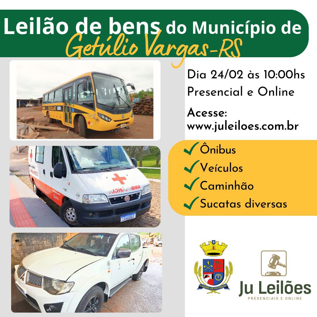 A Prefeitura de Getúlio Vargas promove, no dia 24 de fevereiro, a partir das 10 horas, o Leilão de Bens Móveis do Município, com oferta de veículos e materiais considerados inservíveis para a administração pública. O leilão será realizado de forma presencial e online, ampliando o acesso de interessados de diferentes regiões.