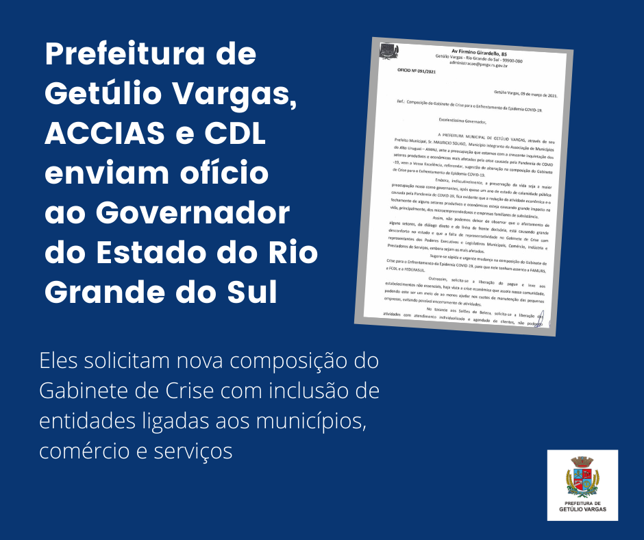 09 No final da manhã desta terça-feira, 9, o prefeito de Getúlio Vargas, Mauricio Soligo, o presidente da ACCIAS, Alceu Enricone, e o presidente da CDL, Leonildo Tasca, assinaram o ofício nº 091/2021, endereçado ao Governado do Estado Eduardo Leite, onde solicitam alteração na composição do Gabinete de Crise para o Enfrentamento da Epidemia Covid-19. Eles sugerem que tenham assento nesse organismo a Famurs (Federação dos Municípios do Rio Grande do Sul), a FCDL (Federação das Câmaras de Dirigentes Lojistas do RS) e a Federasul (Federação de Entidades Empresariais do Rio Grande do Sul). Segundo eles, a não representatividade e o afastamento de alguns setores do diálogo direto da linha de frente decisória está causando grande desconforto em todo o Estado.