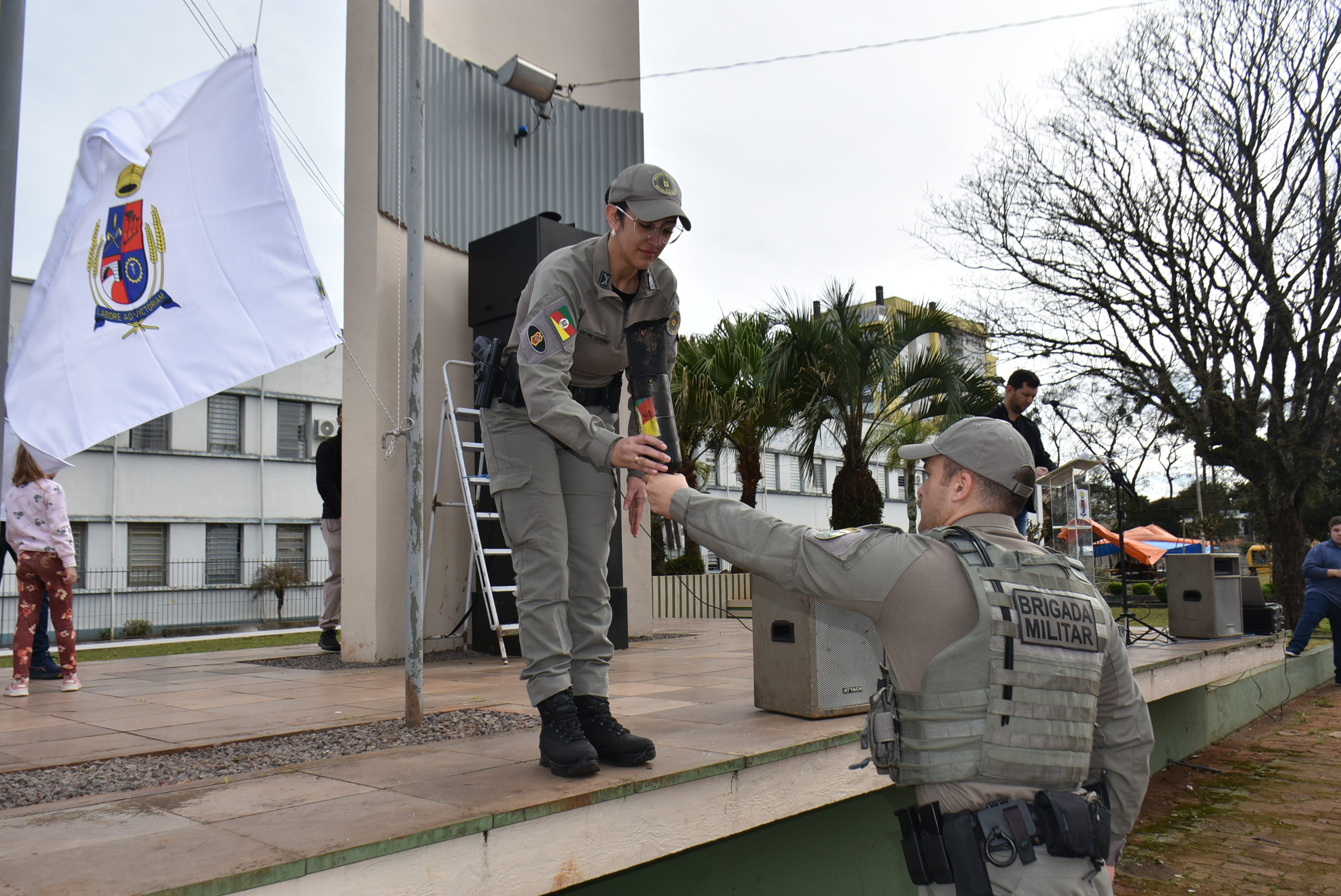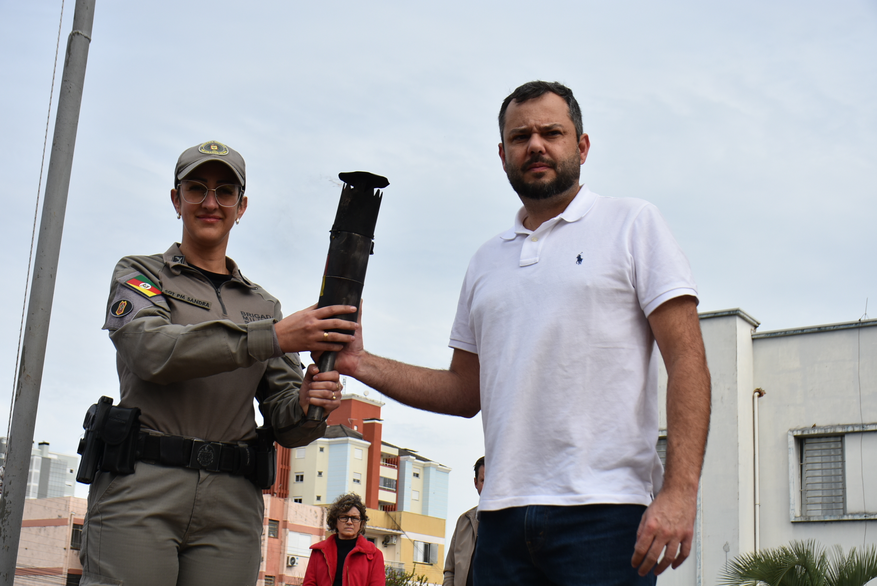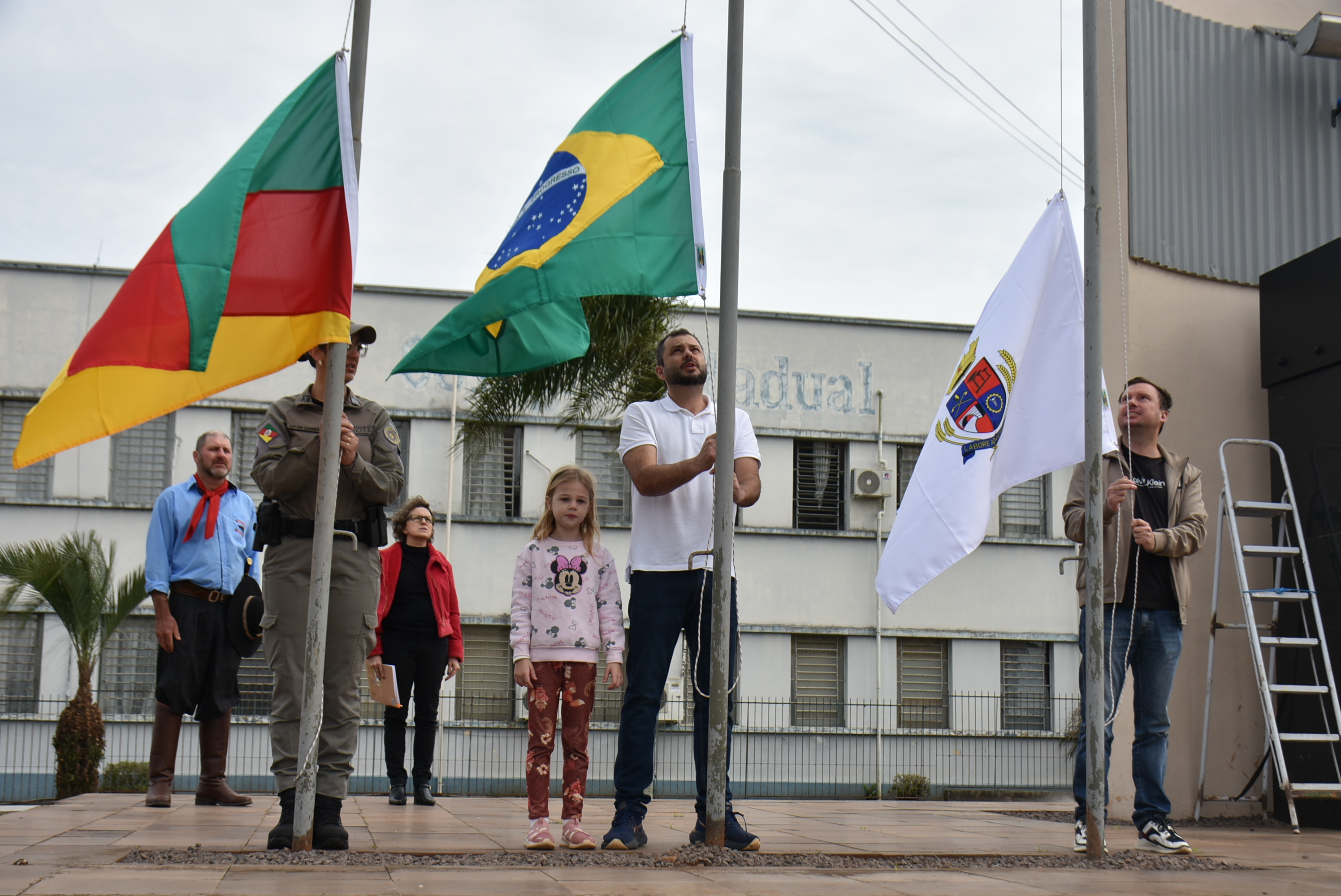 Um dos momentos de emoção foi a chegada do Fogo Simbólico da Pátria, conduzido por um representante da Brigada Militar. A chama foi entregue pela Sargento Sandra Lutkmeier ao vice-prefeito, Dinarte Farias, que acendeu a pira no altar da pátria. Em seguida, ocorreu o hasteamento dos pavilhões: nacional, estadual e municipal, acompanhado pelo Hino Nacional.